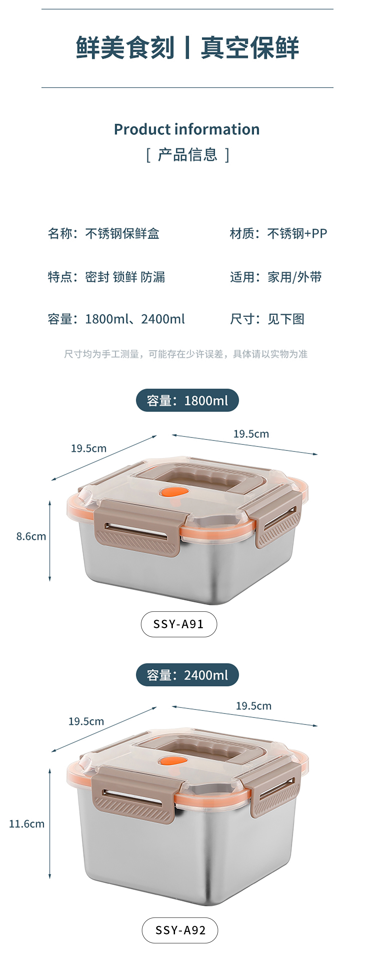 Size: SSY-A91:195*195*86mm/1800ml SSY-A92:195*195**116mm/2400ml